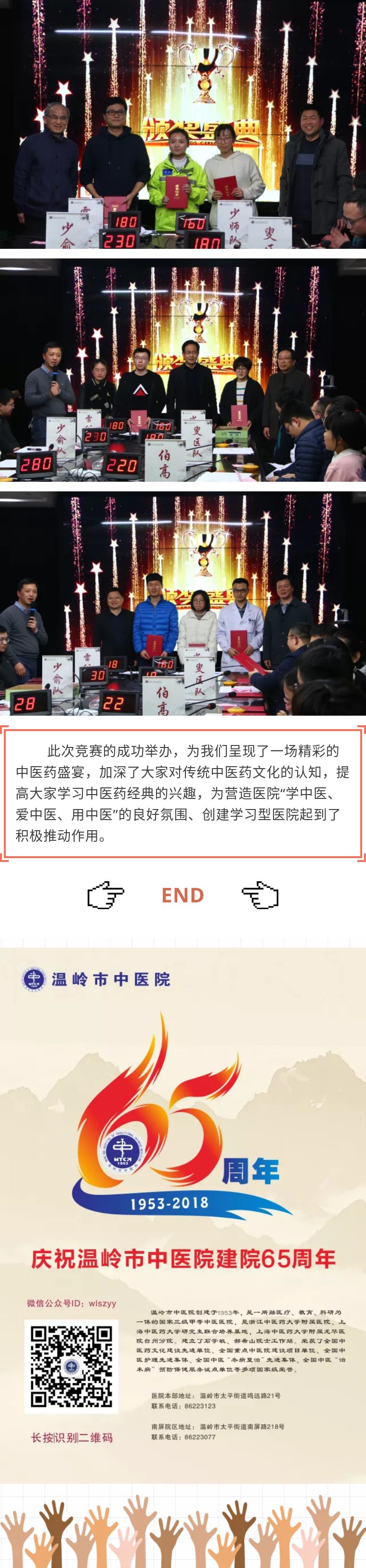 12月24日晚,温岭市中医院建院65周年庆系列活动之一——《黄帝内经》知识竞赛在行政楼五楼会议室举行。来自全院各病区的18名选手分成6支队伍参加了比赛。