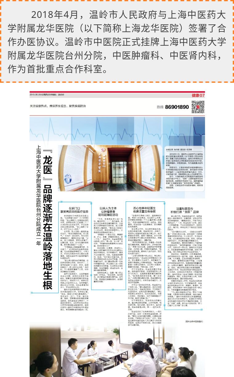 “与上海龙华医院合作后,带动中医肿瘤、中医肾内科的快速发展,造血功能成效明显。”院长徐道绲期望,通过3到5年的共同努力,使温岭市中医院合作科室的中医诊疗水平跻身省内一流之列,整体中医药技术水平得到有效提高,共创“龙医”品牌,助力台州百姓实现“家门口看沪上名中医”的心愿。