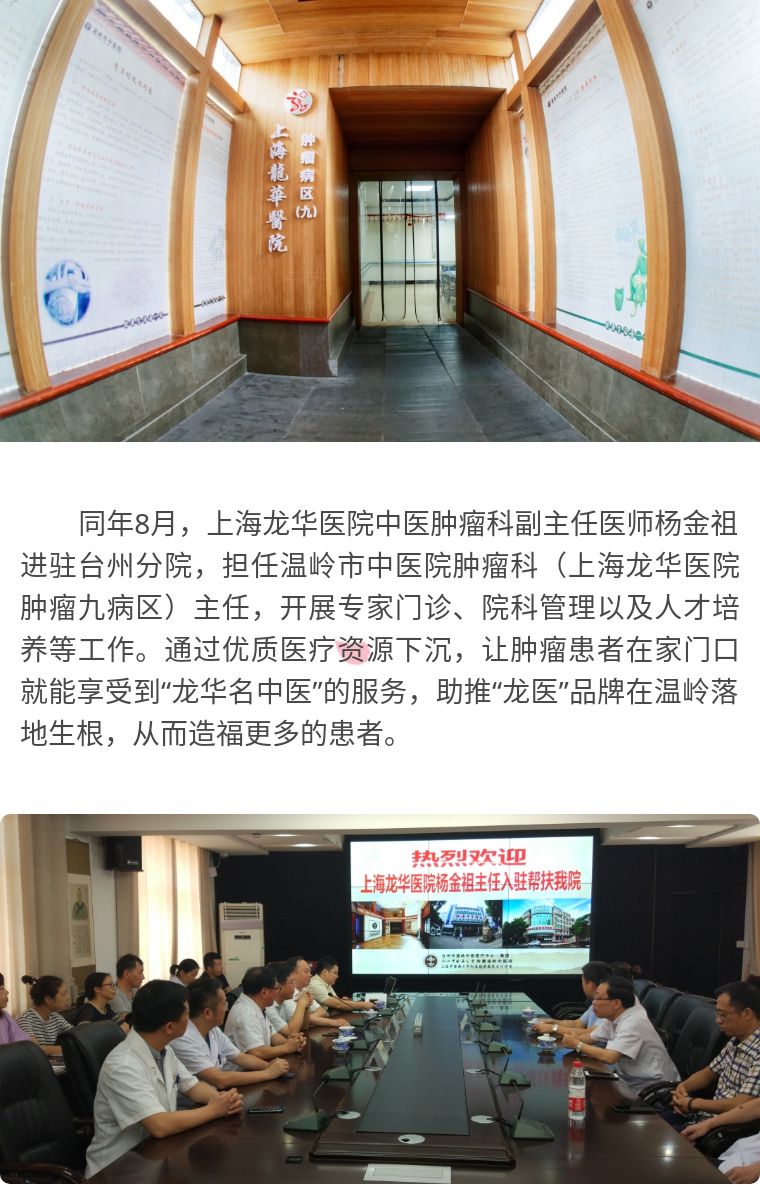 “龙华肿瘤病区,成立初住院率不到60%,随着龙华医院肿瘤专家杨金祖的加入,短短两个月病房住院率就上升到90%以上。”温岭市名中医罗国庆协助杨金祖开展医教研工作,他告诉记者,“现在,病房基本每天都是满的。”来自玉环、乐清、三门、宁波、瑞安、苍南等地的肿瘤患者慕名前来。