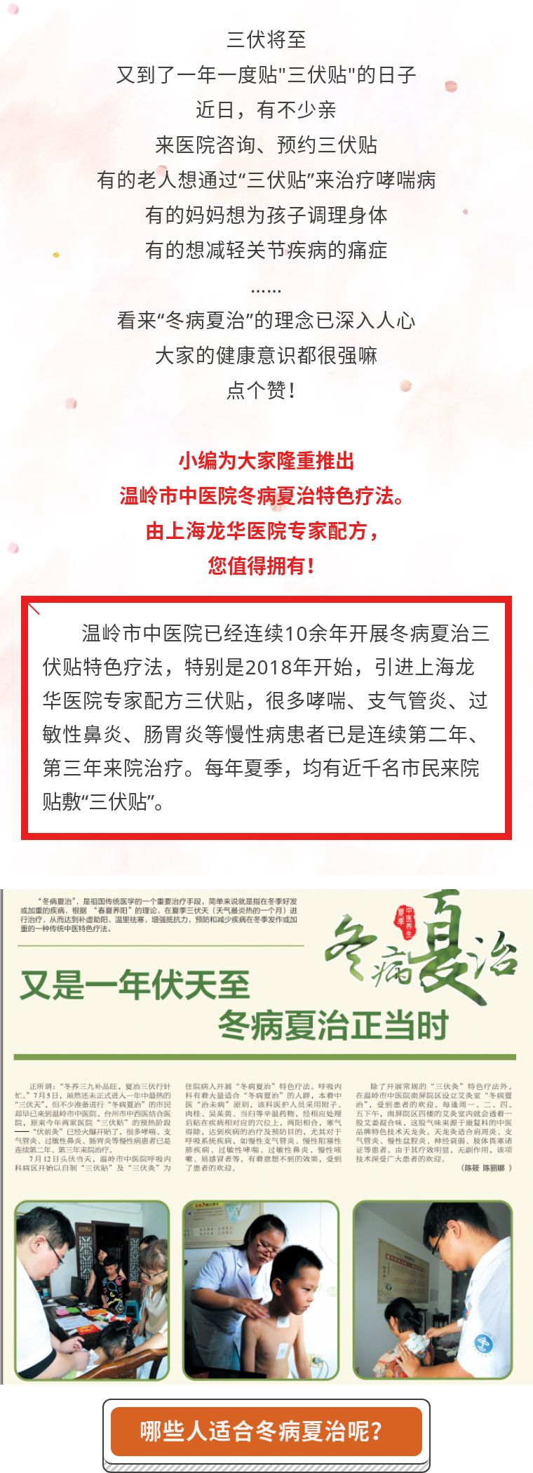 “冬病夏治”,是中国传统医学的一个重要治疗手段,简单来说就是指在冬季好发或加重的疾病,根据 “春夏养阳”的理论,在夏季三伏天(天气最炎热的一个月)进行治疗,从而达到补虚助阳、温里祛寒,增强抵抗力,预防和减少疾病在冬季发作或加重的一种传统中医特色疗法。