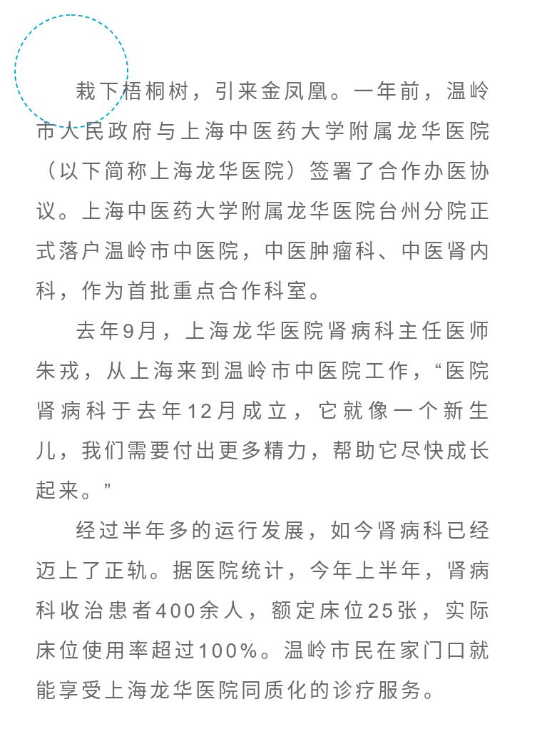 龙兴华医。温岭市中医院院长徐道绲相信,在上海龙华医院的鼎力支持下,在“龙医团队”的带领下,沪温两地将共同为中医药事业的腾飞而不懈努力,完成“共享资源、共创健康、传承中医、造福一方”的使命,让“龙医”品牌在基层开出杏林之花。