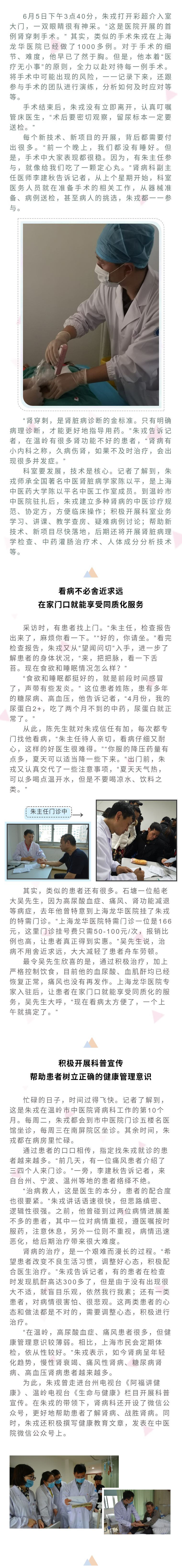 规范治疗,这是朱戎在临床治疗上强调的一点。他建立多种肾病的中医诊疗规范、协定方以及肾病调养膏方,不仅方便临床操作,还造福温岭更多患者。“年轻医生,要尽快成长起来。”在肾内科,一至两周要开展业务学习,通过不断分析疑难杂症等方式,提高医疗技术。