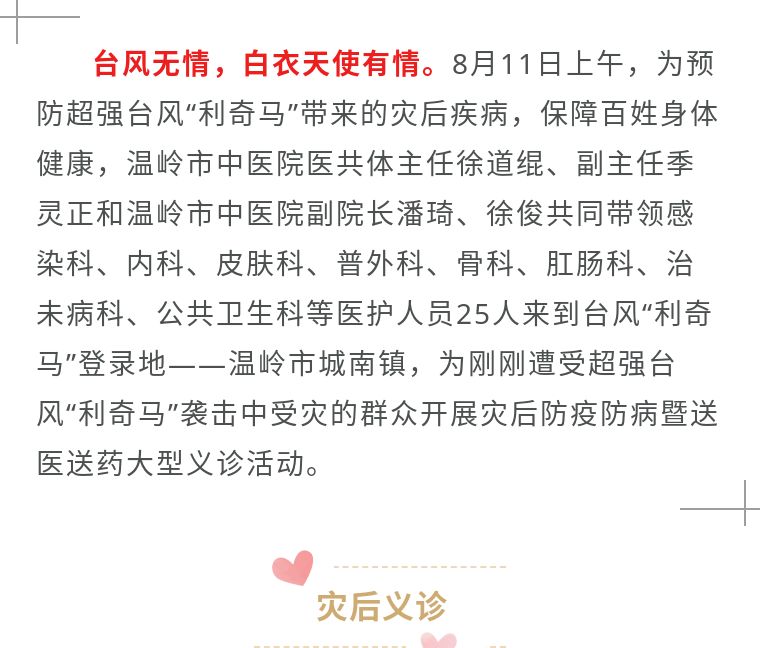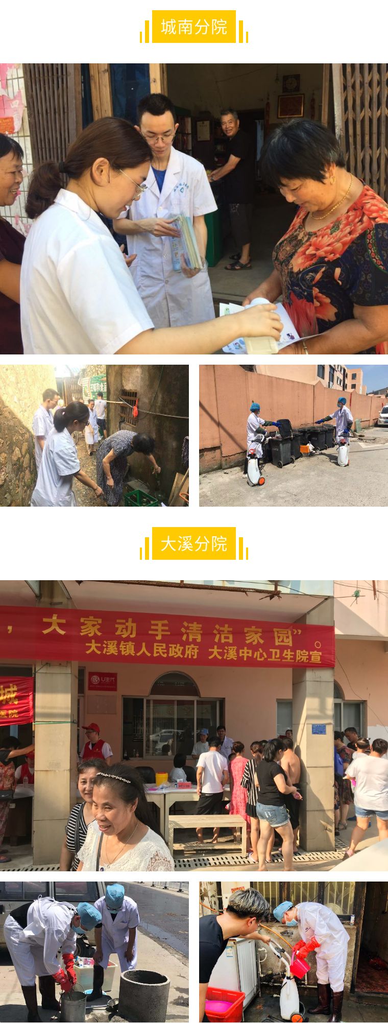 大灾之后防大疫。台风过后,在温岭市中医院医共体的统一部署下,太平分院、泽国分院、石桥头分院、城南分院、大溪分院等分院积极开展灾后防病防疫消杀工作。派出医护人员,深入到各村居悬挂灾后防病横幅、 发放宣传资料,做好灾后防病防疫工作。并要求村卫生室各服务站严密监测灾后传染病疫情。