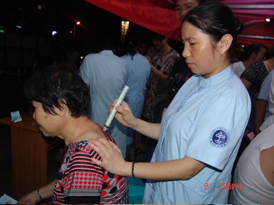 四是发挥优势,力争创新。为注重温岭市中医药知识科普宣传活动的实效,充分发挥国家级中医农村重点专科建设单位针灸推拿科的特色优势,组织了8名医务人员开展了临床常用的中医药适宜技术推广。有耳尖放血疗法治疗高血压病、刮痧疗法治疗痤疮、捏脊手法为主治疗小儿疳积技术、拔罐疗法治疗感冒等技术展演,吸引大批群众体验活动。活动现场的颈椎病养生健康讲座及中医保健操教学活动,也是吸引观众的亮点。