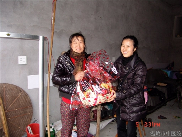 为积极承担公立医院的社会责任,发挥温岭市中医院“省级文明单位”及“市巾帼文明示范岗”的作用,2011年3月5日下午,温岭市中医院党办李进明主任、女工委元国芬主任、血透中心高雪芬护士长,来到城东街道下罗村看望尿毒症患者黄云花和高位截肢病人陈华君,并和该两位贫困患者签订了结对帮扶协议。