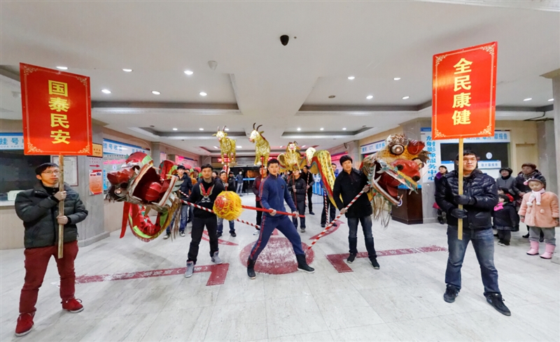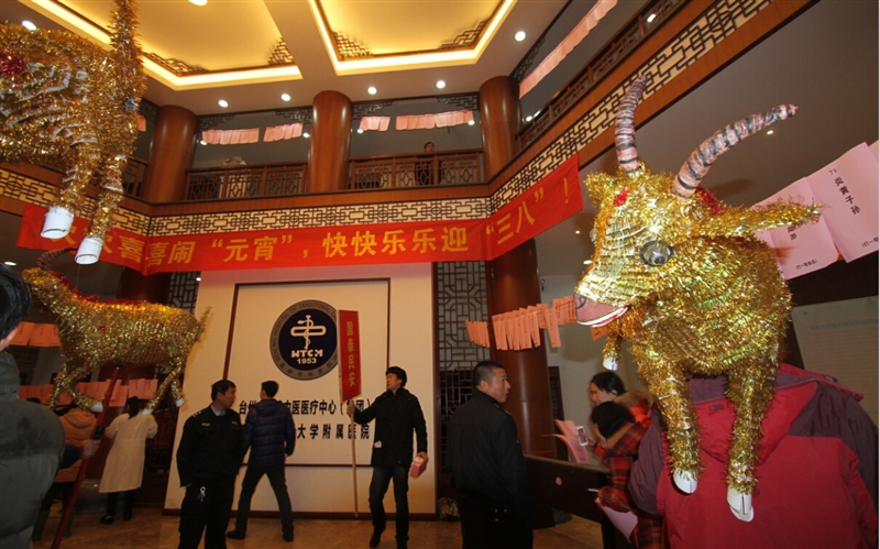 晚上6:00,游园活动在门诊楼前正式开始。医院锣鼓队和女子大鼓队首先登场,铿锵有力的锣鼓声吸引了医院职工、患者家属前来观看,不一会儿,门诊楼前就热闹起来了!门诊大厅里,合着欢快的锣鼓声,20多名职工挥舞着两条祥龙尽情地舞动着。 “三阳开泰!”有观众大声喊了起来,只见三只通体金黄的小羊模型灯饰也热情地加入到了舞龙队伍中来了,很是应景。