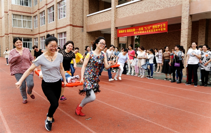 为让广大护理人员在紧张的工作之余放松心情,增强团队协作精神,展示白衣天使健康向上的精神风貌, 5月9日中午,温岭市中医院在太平小学操场举行“超级护士 智勇比拼”趣味运动会,以这一特殊的方式迎接5月12日国际护士节的到来。
