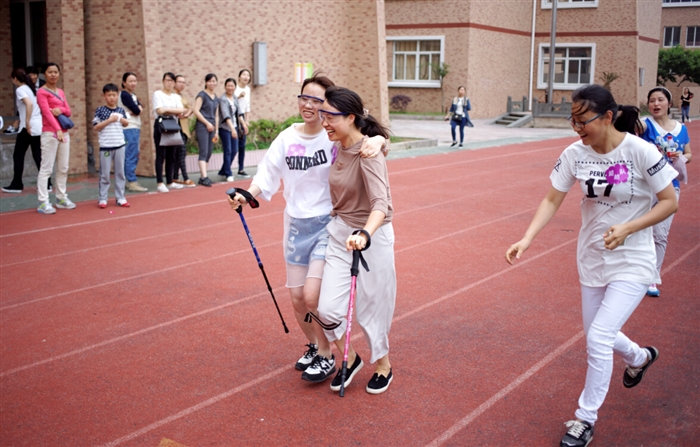 项目三:将心比心扮老人。4名参赛队员,每队2名队员为一组,戴上凡士林眼镜、耳塞、一侧小腿绑上沙包,另一侧膝关节处套上皮筋(即两名队员绑在一起),比赛开始前参赛队员站于起跑线后,裁判发令后,两名队员通过协调配合,向前行进100米,双人配合完成‘穿针引线”动作(其中一人拿针一人拿线),再由另外两名队员同前装束,柱上拐杖(单拐)返回起点,以绑在一起的足触及终点线为计时停止,用时少者名次列前。这个项目考验的是选手之间的团结协作能力,只有配合默契、动作协调,才能顺利达到终点。
