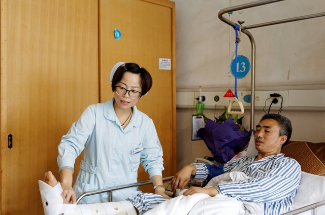 2015年7月7日,温岭市中医院骨科护士长朱仙君为“74大溪事件”伤员杨志金查体。