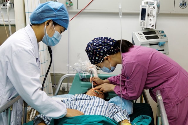 2015年7月8日上午,温岭市中医院ICU医生蔡佳吟和护士刘燕子为“74大溪事件”伤员李金织查体。