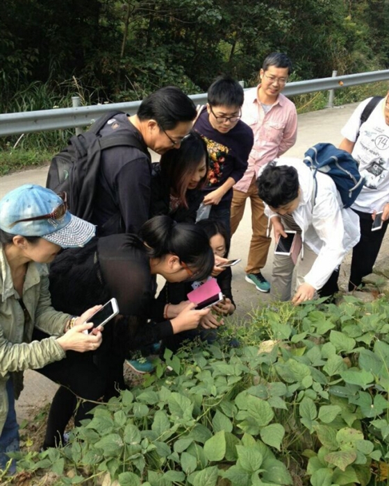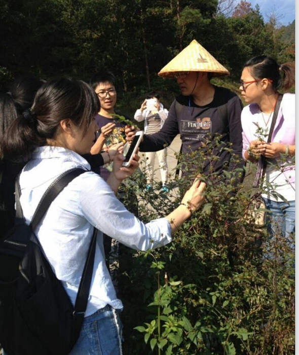 元宝山有我市著名的健身山道,沿途药用植物丰富,最适合边走边教学。陆老师一边仔细辨认各种药用植物,一边给大家耐心讲解各植物的性状鉴别,大家围绕在陆老师周围,虚心的聆听,不约而同的拿出手机拍下讲解过的中草药。有的特意采摘下原植物的一部分带回去做成标本或拍成图片,并标注名称,发在微信中,以便更多的人能共同学习。