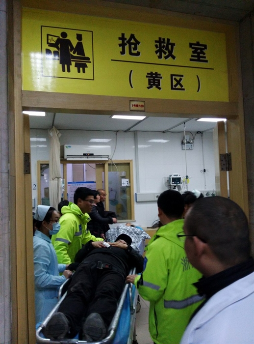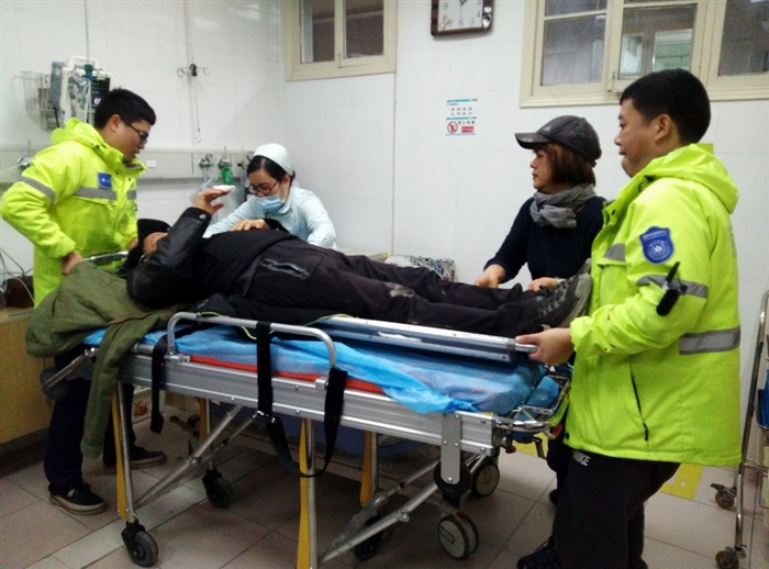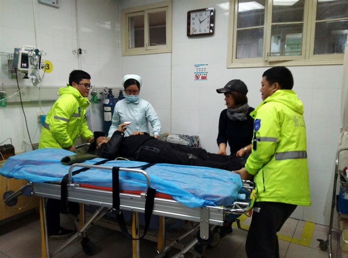 10时9分,温岭市中医院“浙JN503E”急救车接到指令,10时14分迅速出车。10时23分赶到虎山公园山脚下,急救人员了解到求救人在最高的五凉亭,距离山脚大约有1500米山路,医生赵佳盛,护士王兴利,驾驶员郭修华带上急救设备和担架,迅速往山上跑,11时到达山顶,立即对受伤老人进行手部包扎、吸氧。在多位热心市民的帮助下,快速将受伤老人抬上担架,向山脚的急救车转移,老人的女儿和家人也闻讯赶到。11时18分,急救车回到温岭市中医院。当和医生赵佳盛、驾驶员郭修华将病人推向急救室后,跑了几千米山路的护士王兴利面色苍白,差点瘫坐在地,她说:“我一点力气都没有了。”