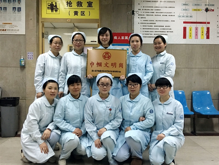 温岭市中医院急诊治疗室现有医护人员35人,其中女性26人,担任着全院最繁重的危重病人的抢救、院前急救和门急诊病人的输液任务,无论白天黑夜,始终奋战在抗击病魔的第一线上,急病人所急、想病人所想,立足岗位,务实创新,在平凡的岗位上勤奋工作,默默奉献,全心全意为患者服务,始终以饱满的工作热情,迎接每一个救治任务。2005年被温岭市政府授予“文明示范岗”,2005年、2006年连获“台州市巾帼文明岗”荣誉,经过十多年不懈努力,成功创建了 “浙江省巾帼文明岗”。