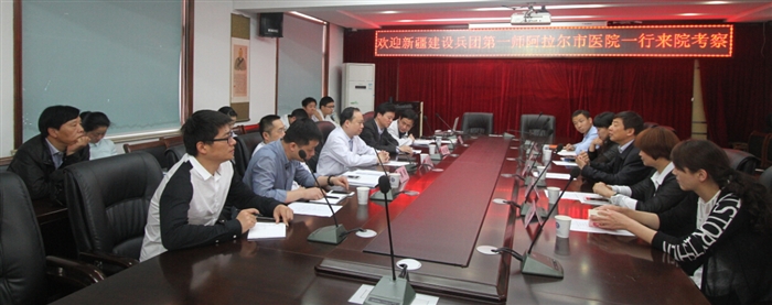 4月29日上午,新疆建设兵团第一师阿拉尔市医院考察组一行5人在该院党委书记王勇的带领下,到我院进行为期一天的中医药发展工作考察。院领导徐道绲、李正祥、陈亨平、潘琦和院办、医务科及护理部等职能科负责人参加接待,并与客人们座谈交流。