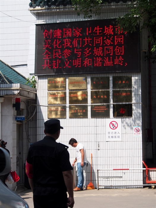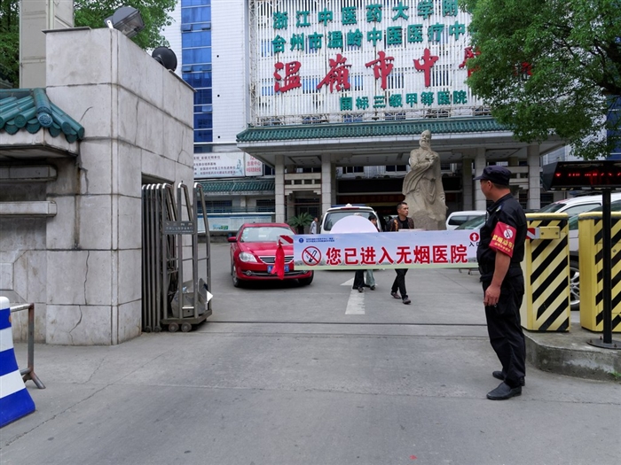 2016年5月31日中午,温岭市中医院保安劝阻一位刚刚进入医院大院的男士吸烟,该男士立即到垃圾桶掐灭香烟。