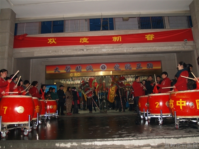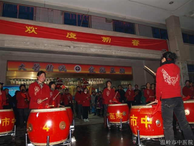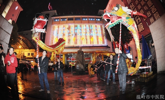 2011年2月17日元宵节当晚,温岭市中医院门诊楼鼓声震天,礼花飞溅,处处弥漫着喜庆的节日气息。由50余名医院职工组成的女子大鼓队和男子舞龙表演队,和着欢快的鼓点,彩龙热烈地舞动着,精彩的表演赢得现场观众阵阵热烈的掌声。当晚,猜谜语、打气球、掷飞镖、套圈等游艺项目引来职工和家属热情参与,营造了喜庆祥和的节日氛围。