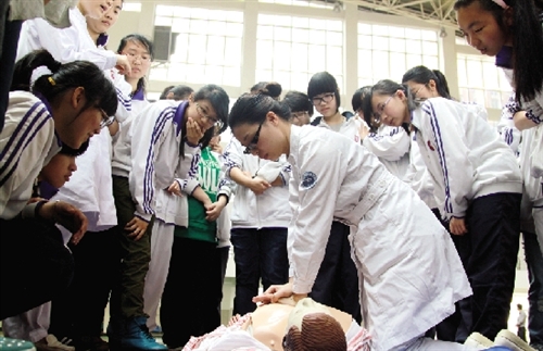 【急救知识进课堂】 5月11日上午,在“5·12”国际护士节和全国“防灾减灾日”前夕,当天,我院20多位医护人员走进温岭中学,开展气管异物急救、溺水急救、触电急救等急救理论知识培训,还在该校五龙体育馆内手把手教会学生学习心肺复苏术操作方法。