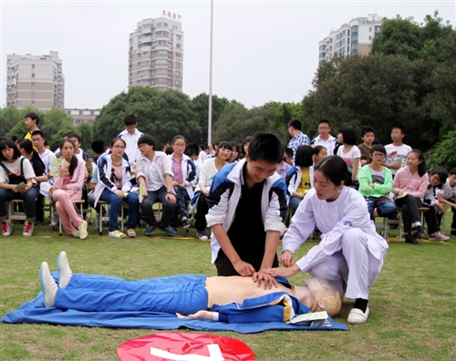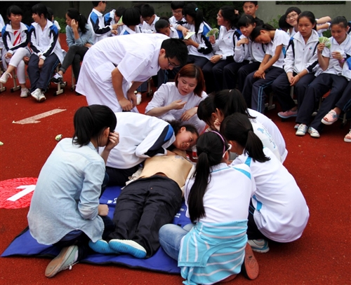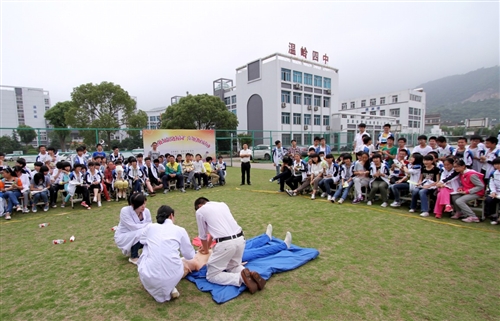 当天,浙江温岭市中医院急救知识进校园活动在温岭市第四中学开展。26位医护人员为温岭市第四中学初一、初二28个班1500多名学生和30多位老师,开展气管异物急救、溺水急救、触电急救等急救理论知识培训,并在校体育场开展现场急救演练,旨在指高学生现场急救能力。