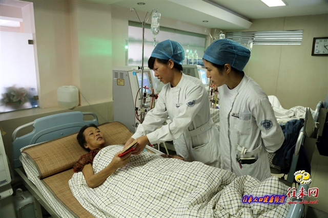 2014年5月29日下午,浙江省巾帼文明岗岗长、温岭市中医院血液净化中心护士长高雪芬(右一)、护士孔林英(中)将5237.5元爱心捐款交到病人林夏芬手里。