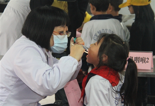 医务人员一来到学校,便受到了师生们的热烈欢迎。在学校食堂搭建的临时体检室里,孩子们以班级为单位,在老师和志愿者的引导下,排成长队,依次来到物理检查、儿科、口腔科、耳鼻咽喉科、眼科等体检点,进行量身高、测体重、听心肺、查耳鼻喉和眼视力等项目的检查。在为孩子们做健康检查的同时,医务人员还向老师仔细询问了他们平时的健康状况,对孩子们常见的疾病进行健康宣教,对体检中发现需要进一步检查的学生建议老师和家长特别关注,及时送医就诊。