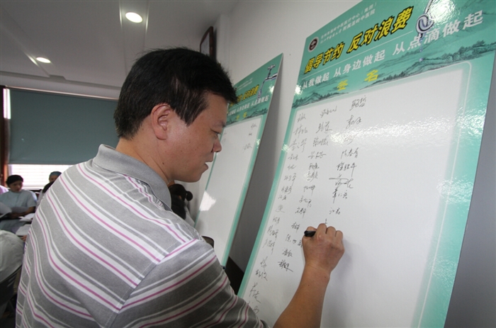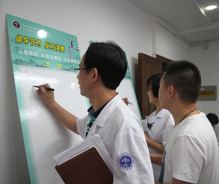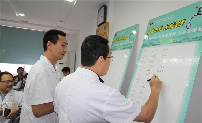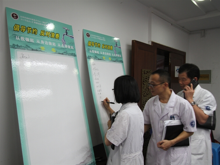 9月8日下午,院周会召开前,徐道绲、李正祥、陈亨平、季灵正等院领导和各科室主任、护士长等带头在“倡导节约反对浪费”签名板上签名,承诺节约从我做起,从身边做起,从点滴做起。此举拉开了我院“倡导节约、反对浪费”主题月活动帷幕。