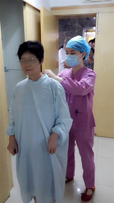 图5为ICU护士探视时间起身迎接并为患者家属穿探视服