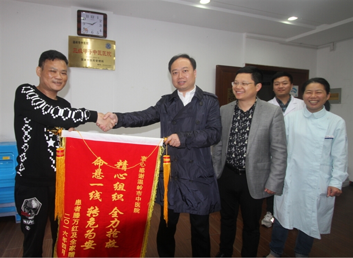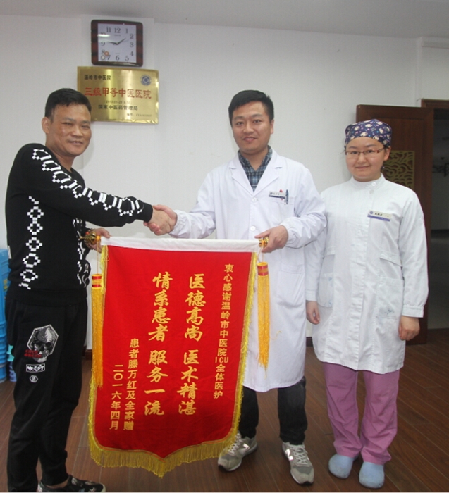 4月21日下午,滕先生在家人的陪同下,将两面写着“精心组织 全力抢救 命悬一线 转危为安”、“医德高尚 医术精湛 情系患者 服务一流”的锦旗送到了温岭市中医院执行院长徐道绲和ICU医护人员代表的手中,感激地说:“是你们不放弃任何一线希望的全力抢救,把我从生死边缘拉了回来。”